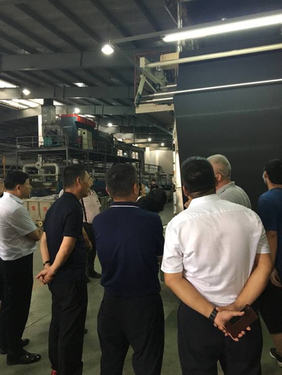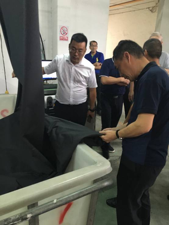 董事长洪亮带领各领导及企业家们参观了我司环保彩色针织牛仔着色项目点,为大家讲述了此工艺的环保特性,让大家实地看到整个印染过程无需用水冲洗,真正达到了低能耗、低排放的环保标准,也解决了传统印染工艺容易拉缸印、折痕等问题。